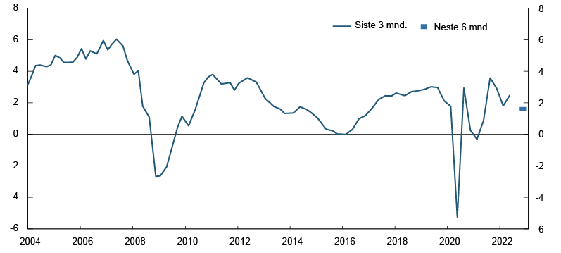 Figur 3. Sysselsettingsvekst Vekst siste tre måneder og forventet vekst neste tre måneder. Sesongjustert. Prosent