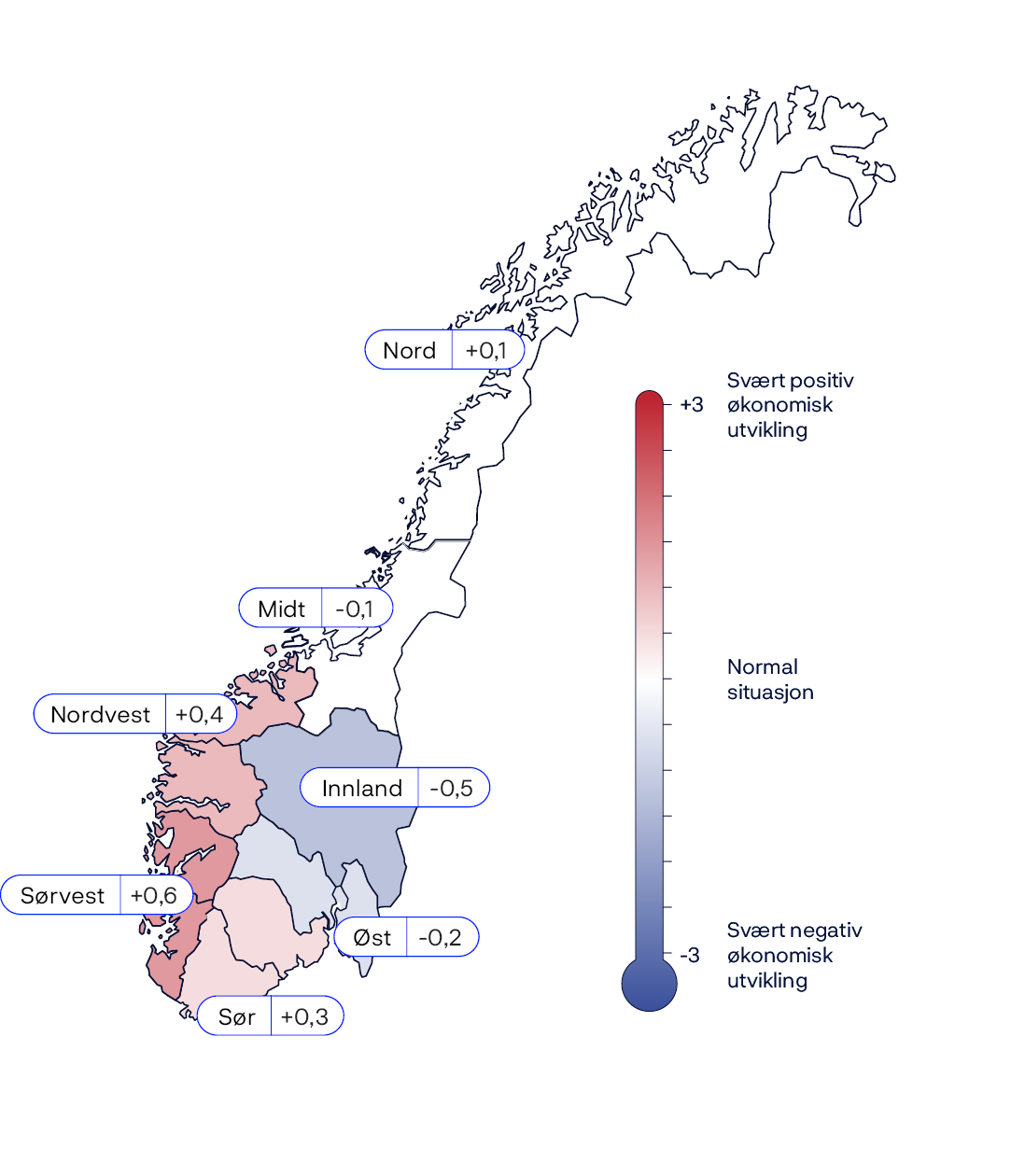 Fra og med forrige runde blir bedriftene spurt om hvordan de på en skala fra -3 til +3 vil tallfeste den økonomiske situasjonen i sin bedrift sett i lys av forhold som etterspørsel, lønnsomhet og utsikter. Tallet null indikerer en normalsituasjon. Den regionale indikatoren er gjennomsnittet av svarene i den enkelte region. Det er relativt små forskjeller mellom regionene. Som i forrige runde er det bedriftene i region Sørvest som er mest positive med en gjennomsnittscore på 0,6. Også i Nordvest og Sør er bedriftene mer positive enn i resten av landet. Der er gjennomsnittscoren henholdsvis 0,4 og 0,3. På Vestlandet og Sørlandet påvirkes økonomien mye av høy aktivitet og store investeringer i energisektoren. I likhet med forrige runde, er det bedriftene i region Innland og region Øst som er mest pessimistiske med en score på -0,5 og -0,2. I disse regionene dempes økonomien av nedgangen innenfor varehandel og bygg- og anleggsrelaterte bedrifter. I region Innland er scoren litt lavere enn sist, noe som indikerer en forverring av situasjonen i denne delen av landet.