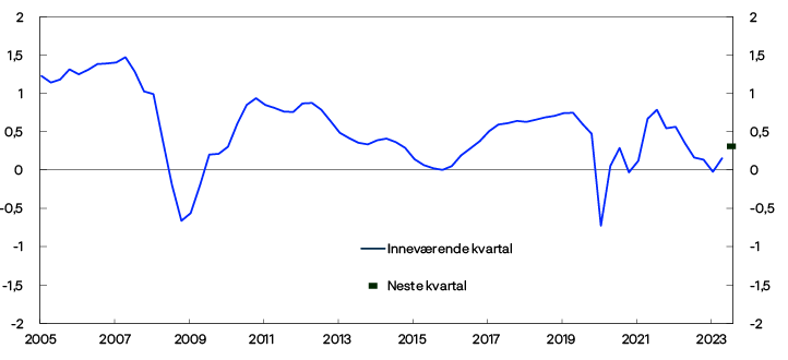Forventet vekst inneværende kvartal og neste kvartal. Sesongjustert. Prosent