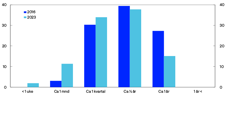 Lønnsomheten hos bedriftene er litt svakere enn for ett år siden (se figur 6). Nedgangen blir særlig knyttet til den kraftige oppgangen i kostnadene, og en del peker på at høy lønnsvekst vil påvirke inneværende kvartal. Bedriftene innen bygg og anlegg og varehandel melder om det største fallet i lønnsomhet. I disse næringene svekkes marginene av lavere aktivitetsnivå enn i fjor. I denne rundens spesialtema spurte vi bedriftene hvordan de forventer at kostnadene deres vil utvikle seg i andre og tredje kvartal inneværende år. Svarene indikerer at kostnadene vil øke mer i andre enn i tredje kvartal (se figur 7). Det er særlig lønnskostnadene og svekkelsen i kronekursen som trekker opp kostnadene fra første til andre kvartal. Samtidig svarer nær halvparten av bedriftene at de endrer prisene oftere enn før pandemien (se figur 8). Blant de husholdningsrettede bedriftene svarer seks av ti at de endrer prisene oftere, og to av ti svarer mye oftere. Kun et fåtall svarer at de endrer prisene sjeldnere. Bedriftene ble videre spurt om hvor raskt endringer i kronekursen vil påvirke egne utsalgspriser. Dette spørsmålet stilte vi bedriftene også i starten av 2016. Svarene fra varehandelsbedriftene tyder på at kronekursen nå får raskere effekt på prisene i varehandelen enn da (se figur 9). Hovedvekten av varehandelsbedriftene svarer at valutakursen får effekt på utsalgsprisene etter mellom et kvart og et halvt år. Knappe 15 prosent svarer at effekten kommer raskere enn dette, mens om lag like mange at det tar rundt ett år.