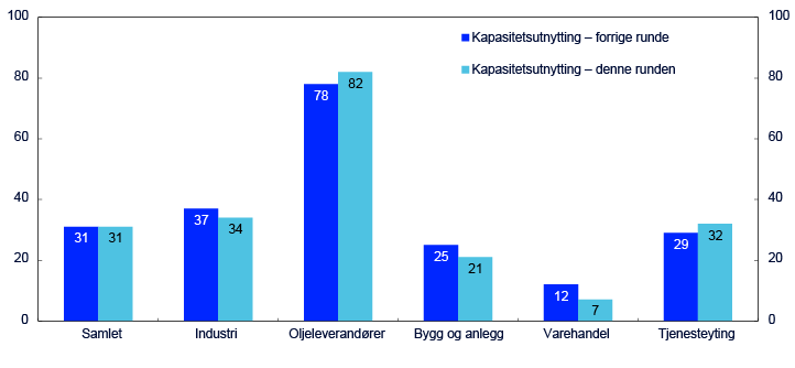 Andelen bedrifter med full kapasitetsutnytting nådde en topp i første kvartal 2022, og har falt siden. Fra forrige runde er andelen uendret (se figur 3 og figur 4). Siden starten av 2021 har kontaktpersonene blitt spurt om hvordan kapasitetsutnyttingen er sammenlignet med hva de oppfatter som normalt for sin bedrift. De siste to rundene har det vært klart flere bedrifter som har svart at kapasitetsutnyttingen er lavere enn normalt enn som har svart over. Det samsvarer med at andelen bedrifter med kapasitetsproblemer er lavere enn sitt historiske gjennomsnitt. I bygg og anlegg er andelen den laveste siden slutten av 2015. Det skyldes at mange bygg- og anleggsbedrifter har valgt å holde på en stor del av arbeidskraften i påvente av at oppdragsmengden skal ta seg opp igjen. Også andelen bedrifter som har problemer med å få tak i kvalifisert arbeidskraft er uendret fra november. Det er betydelig knapphet på arbeidskraft innenfor en del yrkesgrupper som for eksempel ulike typer ingeniører, elektrikere og mekaniske fagarbeidere. Utfordringer med å få tak i den rette kompetansen ser ut til å være størst utenfor storbyene. Flere er ikke villige til å flytte på seg for å jobbe i mindre sentrale områder og enkelte har for høye lønnsforventninger. Sysselsettingsplanene for første kvartal er litt oppjustert fra forrige runde, og bedriftene ser nå for seg en svak vekst i sysselsetting i første kvartal. Videre tror de sysselsettingen vil øke litt igjennom våren.