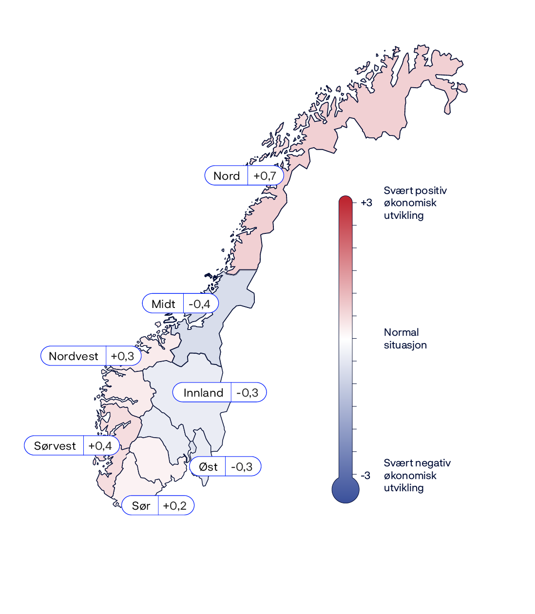 Bedriftene blir spurt om hvordan de på en skala fra -3 til +3 vil tallfeste den økonomiske situasjonen i sin bedrift sett i lys av forhold som etterspørsel, lønnsomhet og utsikter. 0 indikerer en normalsituasjon. Den regionale indikatoren er gjennomsnittet av svarene i den enkelte region. Gjennomsnittet av de syv regionene er litt positiv denne runden. De regionale indikatorene i Innland, Midt og Øst ligger under null. Region Nord har den sterkeste scoren denne runden og må sees i sammenheng med god utvikling innenfor fiskeindustrien og turistnæringen.