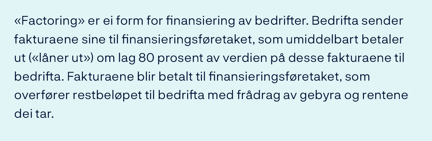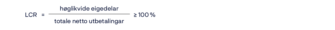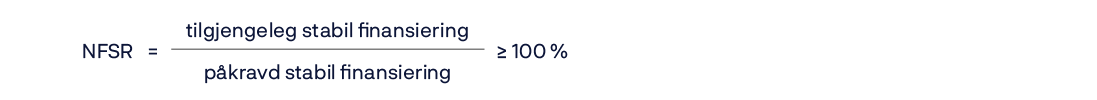 «Net Stable Funding Ratio» (NSFR): Stabil finansiering i prosent av lite likvide eigedelar. Kravet er at NSFR skal vere minimum 100 prosent.