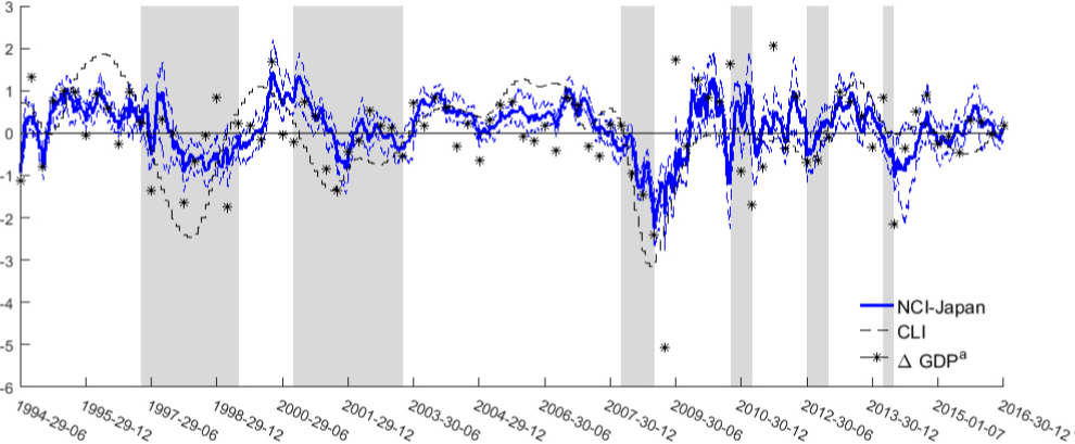 Figure 1: Δ GDPª is standardized output growth. It is recorded at the end of each quarter. The colored solid line is the standardized (median) estimate of the daily business cycle index, while the dotted colored lines are the 68 percent probability bands. The gray shaded areas illustrate recession periods as defined by NBER (US), ERCI (Japan), and CEPR (euro area).
