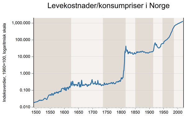 Figur 1. Levekostnadsindeks for Norge, tilbake til 1492.