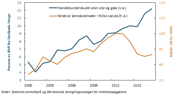 Nedgangen i oljeprisen fra høsten 2014 gikk sammen med en markert bedring av norske bedrifters kostnadsmessige konkurranseevne, i hovedsak fordi kronen svekket seg. I 2017 var de relative lønnskostnadene målt i felles valuta 14 prosent lavere enn i 2013, se figur 1. Det er vanlig å anta at en slik utvikling vil bidra til økt økonomisk aktivitet. Både innenlandske og utenlandske kunder ventes å vri etterspørselen mot norske bedrifter, og handelsbalansen blir mer positiv. Norges handelsbalanse har imidlertid gått i motsatt retning de siste årene. Til tross for kronesvekkelsen har handelsunderskuddet utenom olje og gass bare blitt større, se figur 1.