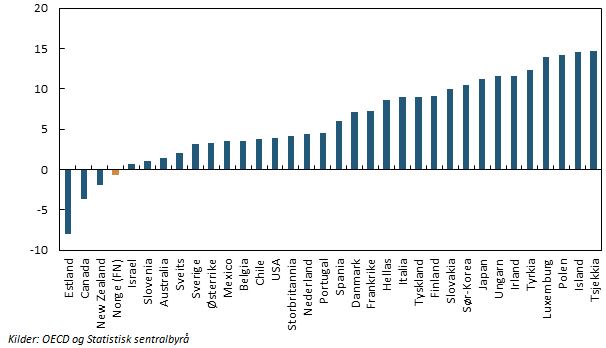 Av figuren ser vi at Norge er et av de få landene hvor importandelen i eksporten ikke har økt. Noe av forklaringen kan være at beregningene er gjort på tall i løpende priser, og at prisutviklingen på verdiene som skapes i Fastlands-Norge (FN) har vært forholdsvis høy sammenlignet prisutviklingen på den importerte vareinnsatsen. Hadde beregningen vært gjort på volumtall, ville den etter alt å dømme vist en økende importandel også i Norge. Samtidig kan det også være at den geografiske beliggenheten har bidratt til at de grensekryssende produksjonskjedene ikke har blitt like utbredt her hjemme som i små, åpne økonomier på kontinentet.