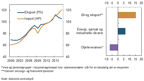 Vi fortsetter gjennomgangen av eksport- og importutviklingen de senere årene i det neste blogginnlegget, men da baserer vi oss på empiriske modeller for eksporten og importen. Vi tillater oss å røpe noen av hovedfunnene allerede her. De empiriske modellene indikerer at utviklingen i utenrikshandelen de siste årene har vært nokså godt i tråd med historiske mønstre, og at utviklingen ville vært klart svakere uten fallet i kronekursen. Ifølge estimatene har særlig oljeleverandørene fått god drahjelp av den svakere kronen.