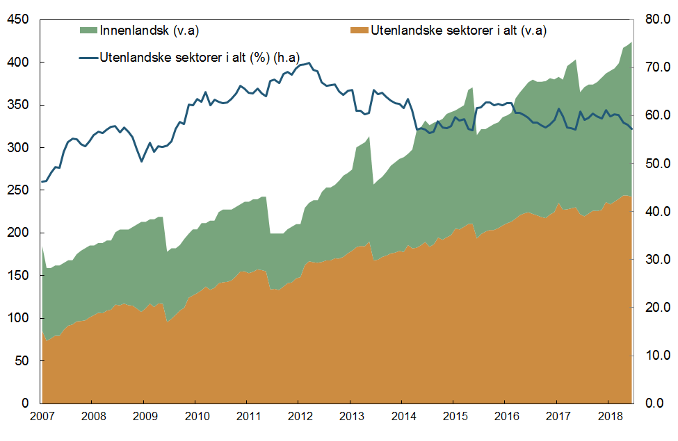 Figur 2: Eiersammensetningen i statsobligasjoner fordelt på norske og utenlandske investorer. Milliarder kroner og i prosent av utestående beholdning. Kilde: VPS