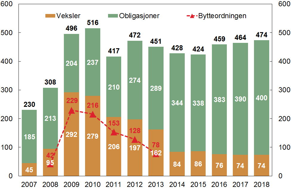 Utenlandske investorer har tradisjonelt vært interessert i å kjøpe norske statsobligasjoner. De sitter med noe over 60 prosent av utestående lån. I vekslene er norske investorer dominerende, og da særlig banker og livselskaper.