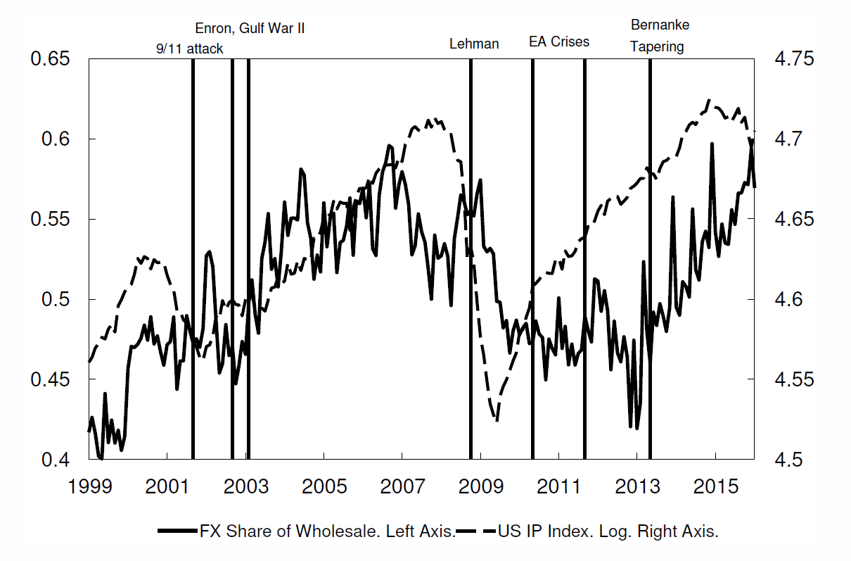 In recent research, Christine Blandhol and I use monthly data from Norwegian banks’ balance sheets (1999 – 2016) to analyze determinants of gross capital inflows to Norway. Our results indicate that gross inflows to Norway are mainly determined by global real activity, while the global financial cycle is less important. Figure 1 informally indicates that there may be a relationship between the foreign funding of Norwegian banks and global activity measured by US industrial production. We measure gross foreign funding as banks’ foreign currency market funding as a share of total market funding.