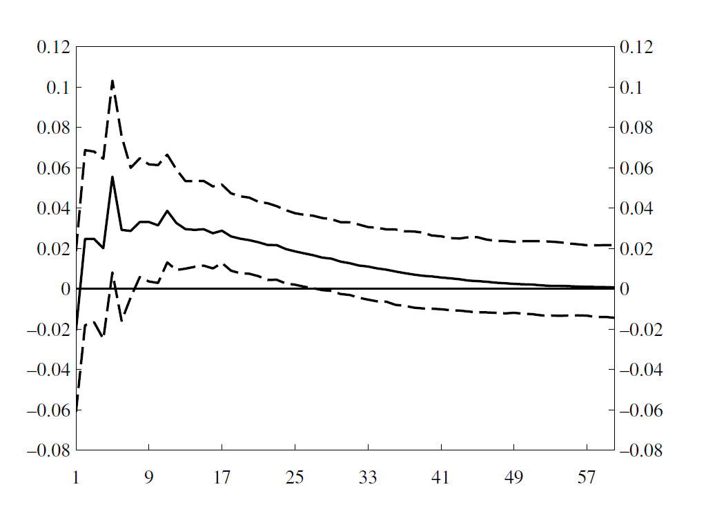 We estimate a structural VAR model, and we find that when global activity (proxied for example by US Industrial Production) falls, Norwegian banks’ foreign currency funding share falls after about one year, as illustrated in figure 2.