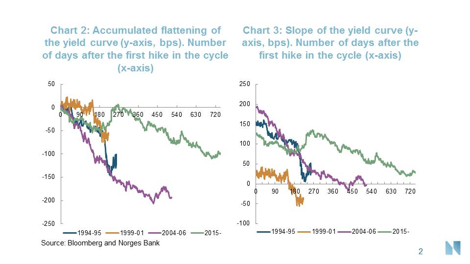 As evident in chart 1, the yield curve, from here on defined as the differential in yield between a 10-year and a 2-year US Treasury security, has flattened in this hiking cycle as short-term rates have risen more than long-term rates. As chart 2 shows, the yield curve also flattened in the previous hiking cycles. As a matter of fact, the flattening was more pronounced in the 1994-95 and the 2004-06 cycles. This is in part related to the fact that the slope of the yield curve was sitting at higher levels going into those two cycles, see chart 3. In addition, the monetary policy normalization has been more gradual this time around, resulting in a more benign increase in short-term rates than in the two mentioned previous cycles. Nevertheless, the flattening of the yield curve in all the three preceding hiking cycles goes to show that there’s nothing extraordinary with the flattening this time around. However, given that long-term rates are still relatively low in a historical context and the rise in long-term yields have been relatively benign in this cycle, the behavior of long-term rates warrants further examination.