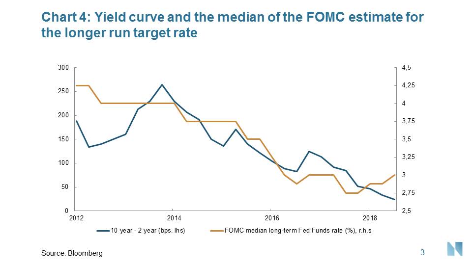 The estimated neutral level of interest rates is an important concept when considering long-term rates and the slope of the yield curve. One way to view the neutral rate is to think of it as the level of interest rates that is neither accommodative nor contractionary, i.e. a level consistent with a closed output gap. There is, due to several reasons, common understanding that this rate is lower than what was the case prior to the crisis. Indeed, as evident in chart 4, the median FOMC estimate for the funds rate over the long run has fallen dramatically over the last years, in tandem with a flatter yield curve. In other words, it’s the view of the FOMC that fundamentals dictate a shallower path for policy normalization this time around. With the zero lower bound acting as a floor for short-term rates, a lower neutral rate should be expected to flatten the yield curve in a hiking cycle as it limits the extent to which long-term yields can rise from a fundamental point of view. Hence, there are valid arguments for why this time is different and that the slope of the yield curve should be flatter in this hiking cycle compared to the past.