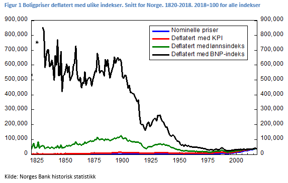 Inntekt sier noe om hva man får i lommeboka. Muligheten til å kjøpe bolig kan også ha sammenheng med samfunnets evne til å produsere boliger i forhold til andre goder. BNP per innbygger er et mål på den samlede verdien av det som produseres i økonomien. Når BNP har økt, reflekterer det både mer effektiv produksjon, og at en større del av samlet produksjon er blitt en del av markedsøkonomien. Samtidig fanger BNP-målet opp at flere er i jobb, at flere får andre inntekter enn lønn (som for eksempel kapitalinntekt), og at det produseres et bredt spekter av tjenester alle får ta del i gjennom velferdsstaten. BNP er derfor et alternativ til lønn når vi skal vurdere kjøpekraften i befolkningen. Deflatert med BNP per innbygger var boligprisene over 15 ganger høyere per kvadratmeter ved inngangen til forrige århundre enn de er i dag! Her har det virkelig skjedd noe med kjøpekraften.
