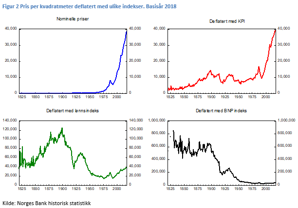 I denne bloggen har jeg brukt tall fra Norges Banks historiske statistikk. Det er stor usikkerhet om historiske dataserier når de er så lange som de vi presenterer her. Blant annet kan det være grunn til å tro at man går langt tilbake har man et mindre representativt utvalg. Typisk vil man ha dårlige tall for arbeiderboliger, som hadde større sannsynlighet for å være utenfor den regulerte delen av boligmarkedet.