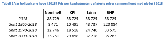 Det enkleste målet er den nominelle prisen – det man faktisk betaler. Gjennomsnittlig kvadratmeterpris i 2018 var høyere enn i noe tidligere år. I de 153 årene som har gått siden 1865 har gjennomsnittlig kvadratmeterpris på bolig falt i 39 år og steget i 114 år. Siste periode boligprisene falt i nominelle termer, var fra 1987 til 1993.