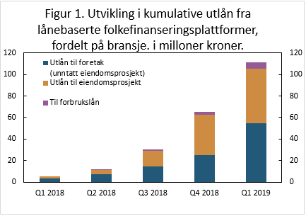 Norges Bank gjennomførte en spørreundersøkelse av de norske aktørene som var i virksomhet våren 2019, for å få bedre oversikt over virksomhetens karakter og omfang. Lånebasert folkefinansiering dominerer det norske markedet. Som det fremgår av figuren vokste lånebasert folkefinansiering raskt igjennom 2018 i Norge. I Norge utgjør forbrukslån en liten andel av lånene, mens det er den dominerende typen folkefinansierte lån i Sverige. I Storbritannia går en betydelig andel folkefinansierte lån til SMB (se artikkelen fra Riksbanken).
