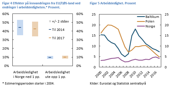 Som figuren viser, påvirkes de estimerte konjunktureffektene lite av at dataperioden utvides. Et fall i den registrerte arbeidsledigheten her hjemme på 1 prosentenhet anslås fortsatt å øke innvandringen med mellom 40 og 50 prosent. Med utgangspunkt i de siste innvandringstallene tilsvarer dette en økning på rundt 13 000 personer. En økning i arbeidsledigheten i fraflyttingslandet på 1 prosentenhet anslås å øke innvandringen fra det aktuelle landet til Norge med 10 prosent. Den estimerte «nettverkseffekten» vises ikke i figuren, men reduseres noe når vi inkluderer data til og med 2017. Det er uansett arbeidsledigheten ute og hjemme som er de viktigste forklaringsvariablene.