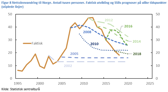 Var den kraftige arbeidsinnvandringen Norge opplevde i etterkant av EU-utvidelsen i 2004 bare en midlertidig bølge? SSBs nylige prognosefeil illustrerer at utsagnet om at det er vanskelig å spå – især om fremtiden – også gjelder for flyttestrømmene på tvers av landegrensene, se figur 8. Det er likevel lov å håpe at den forståelsen av den historiske utviklingen som vi har skissert her, gir oss et visst grunnlag for å mene noe om utviklingen fremover.