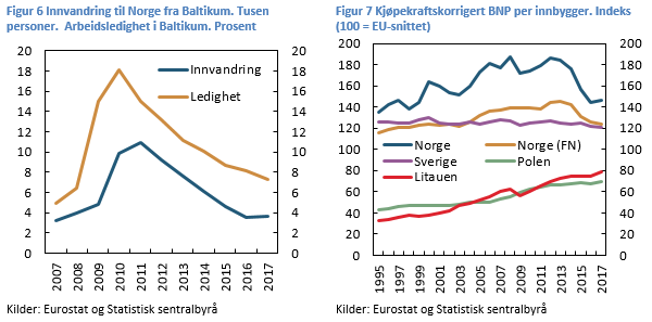Det er uansett interessant å merke seg at inntektsforskjellene til de to viktigste fraflyttingslandene, Polen og Litauen, har blitt mindre over tid, se figur 7. I 2017 var BNP per innbygger i Litauen snaue 40 prosent under nivået i Fastlands-Norge. I 2004, året for EU-utvidelsen, var det tilsvarende inntektsgapet på mer enn 60 prosent. Selv om de økonomiske gevinstene ved å flytte til Norge fortsatt fremstår som betydelige, er de ikke så store som de en gang var.