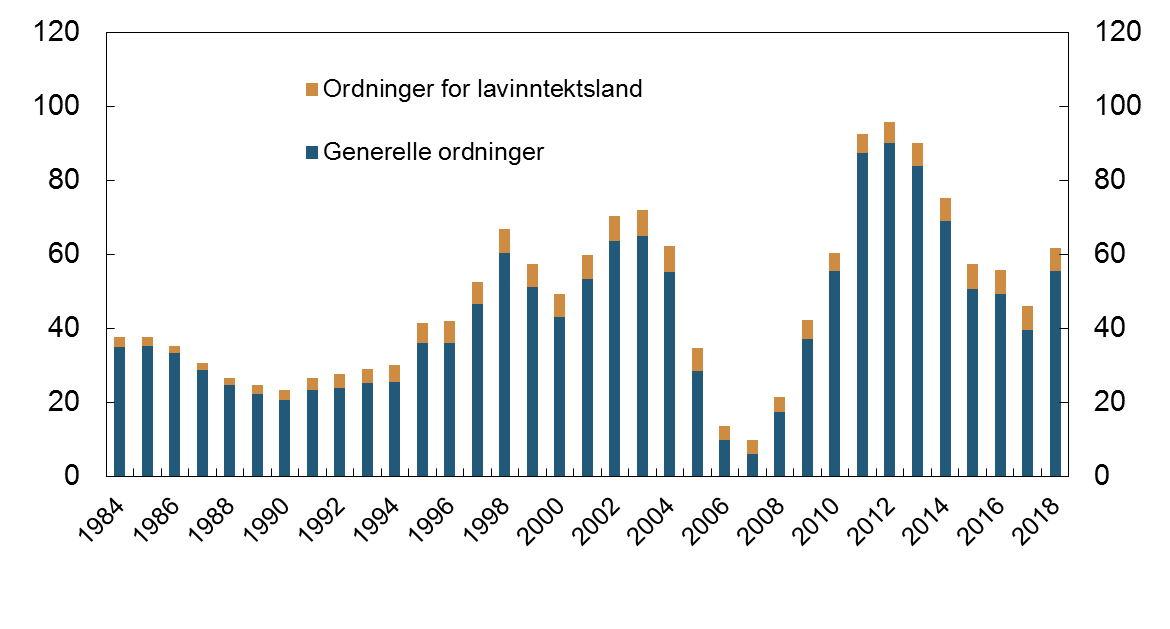 | Figur 1. IMFs utestående lån. Generelle ordninger og ordninger til lavinntektsland. Milliarder SDR*. 1984-2018 (oktober) |