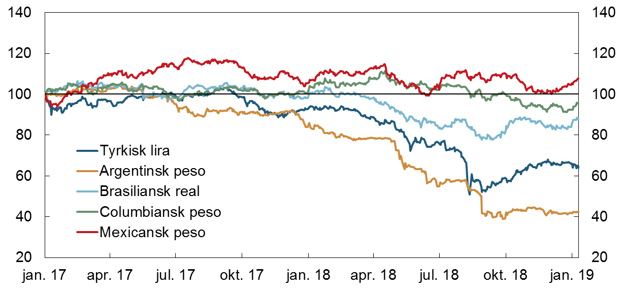 Kapitalinngangen til fremvoksende økonomier bremset opp da pengepolitikken i industrilandene etter hvert ble mindre ekspansiv med renteoppgang i USA (fra desember 2015) og sterkere dollar. Fra april 2018 strømmet finanskapital fra fremvoksende økonomier til industrilandene. Valutaene til mange fremvoksende økonomier svekket seg, men ikke så mye for gruppen samlet. Særskilte forhold forverret situasjonen i enkelte land som Argentina og Tyrkia, og valutaene til disse landene svekket seg kraftig (figur 2). Det førte til at det ble mer krevende å betjene gjelden som var utstedt i dollar.