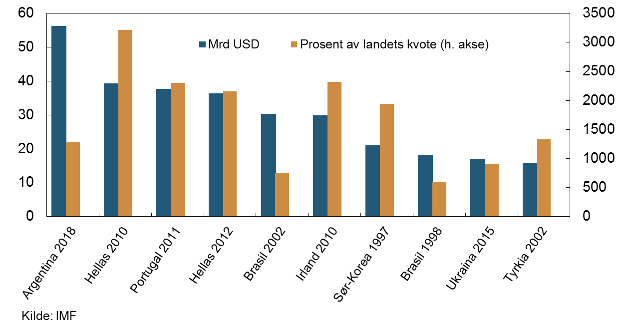 IMFs styre godkjente 20. juni 2018 et lån til Argentina på 35,4 milliarder SDR. Lånet ble 26. oktober økt til 40,7 milliarder SDR (472 milliarder norske kroner). Dette er nominelt det største ordinære lånet IMF noen gang har innvilget. Men i forhold til landets medlemsinnskudd (kvote) i IMF var blant andre lånene til Hellas, Irland og Portugal under eurokrisen betydelig større, se figur 3. Så langt har Argentina fått utbetalt om lag halvparten av lånet, mens resten utbetales kvartalsvis fram til juni 2021.