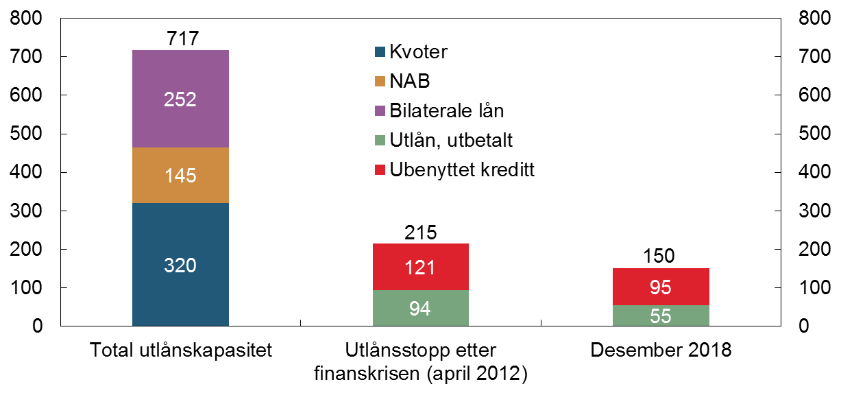Figur 4 viser IMFs tilgjengelige utlånsmidler sammenlignet med faktiske utlån i desember og utlånstoppen etter finanskrisen. Fratrukket kvotene til land som ikke har finansieringsevne og 20 prosent likviditetsreserve, har IMF midler disponible for utlån på om lag 717 milliarder SDR (IMFs egen reservefordring), om lag 8600 milliarder kroner. For tiden er faktiske utlån og ubenyttede kredittlinjer vesentlig lavere enn toppen i 2012.