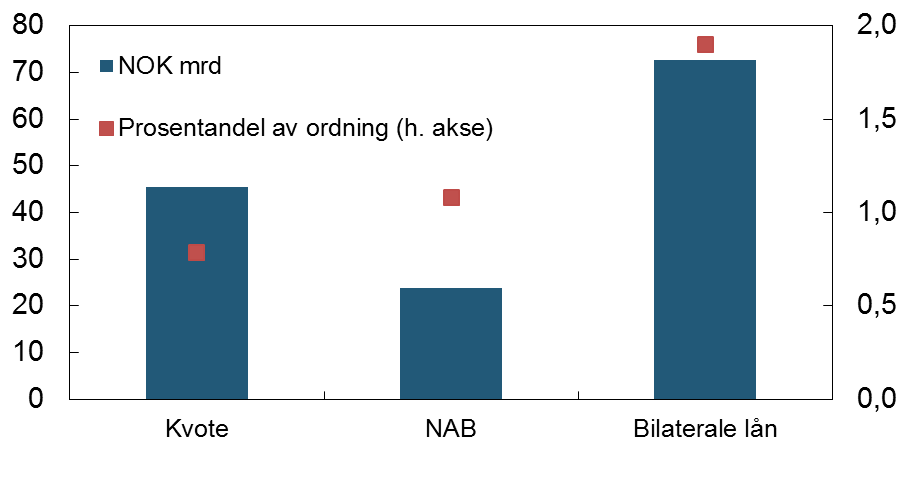 Norge har stilt til disposisjon 11,7 milliarder SDR, som ved årsskiftet tilsvarte om lag 142 milliarder kroner, for IMFs generelle låneordninger, se figur 5. I tillegg har Norge bidratt til de subsidierte låneordningene for lavinntektsland, som har sin egen finansieringsordning. Bare en liten andel av midlene er blitt trukket. Risikoen Norge tar, er meget liten. Norges fordringer er mot IMF og ikke mot landene som til enhver tid låner fra IMF. Sikkerheten for lån til IMF vurderes som meget god. Programtiltakene skal sikre at landet blir i stand til å betale tilbake til IMF. Det er presedens for at IMF får tilbakebetalt sine fordringer før andre kreditorer, og IMF har aldri tapt på utlån.