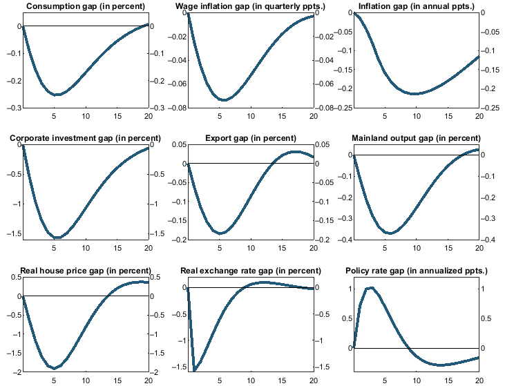 A rise in the policy rate affects the macroeconomy through two main channels: A reduction in domestic aggregate demand and a stronger real exchange rate. Initially, the higher interest rate is passed on through the banking sector to households, who suppress their consumption, and to firms, which reduce their investment, resulting in a fall in mainland output. Firms also reduce their demand for labor, leading to a reduction in wage growth. Additionally, a fall in house prices makes banks less willing to offer new loans to households, reinforcing the decline in consumption.