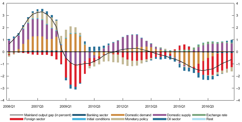 In the more recent years, negative impulses from abroad (particularly low exports) have again contributed to a downturn, according to NEMO’s interpretation of the economic developments. Lower oil prices and oil investment (in blue) have had similar but less pronounced effects on the output gap. The limited negative contribution to mainland output from lower oil prices can be partly attributed to accommodative monetary policy. A weak exchange rate (in green) has also had a positive effect on output.