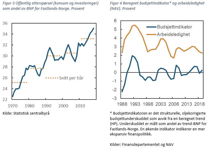 Over tid har det offentliges kjøp av varer og tjenester over tid vokst som andel av økonomien. I 2018 utgjorde etterspørselen fra offentlig forvaltning 35 prosent av verdiskapingen i fastlandsøkonomien, opp fra et gjennomsnitt på rundt 30 prosent på 1990- og 2000-tallet, se figur 3. Den offentlige pengebruken har særlig blitt trappet opp i perioder med økende arbeidsledighet, se figur 4. Om noe kan det synes som om responsen på høyere arbeidsledighet har blitt sterkere de senere årene.