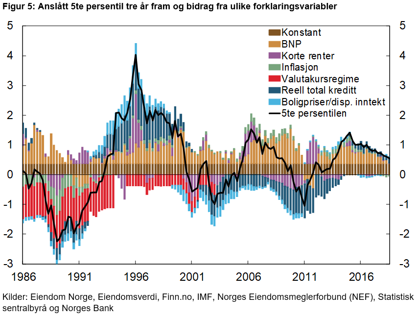 Men vi er også opptatt av hvorfor modellen signaliserer økt sårbarhet. Figur 5 viser den historiske utviklingen i den femte persentilen tre år frem og søylene viser bidragene fra de ulike forklaringsvariablene. I perioden før bankkrisen bidro rask vekst i kreditt og boligpriser til et fall i den femte persentilen. Også høy inflasjon og raskt økende renter bidro negativt. Ved å øke nedsiderisikoen i økonomien, bidro også den faste valutakursen til en mer sårbar økonomisk utvikling.