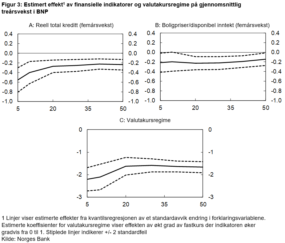 Flere internasjonale institusjoner (Bank of Canada, Bank of England, ECB og IMF) har tatt i bruk «growth-at-risk» for å tallfeste virkningen av finansielle ubalanser på realøkonomien på mellomlang sikt (2-3 år frem i tid). I dette rammeverket tallfester de hele utfallsrommet for BNP-veksten ved å bruke såkalte kvantilregresjoner. Disse tar høyde for at finansielle indikatorer kan virke sterkere på risikoen for kraftige tilbakeslag i økonomien enn for mer sannsynlige utfall.