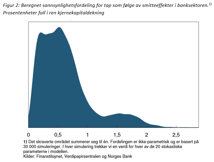 Figur 2 viser hvordan smitteeffekter kan fordele seg. Arealet under grafen i et intervall tilsvarer sannsynligheten for at smitteeffektene skal havne i det gitte intervallet. Fra figur 2 ser vi at smitteeffekter som oftest vil føre til en reduksjon i ren kjernekapitaldekning på rundt 0,5 prosentenheter, men i enkelte tilfeller kan smitteeffekter føre til et fall i ren kjernekapitaldekning på rundt 2 prosentenheter. Vi finner at direkte smitte inntreffer svært sjelden.