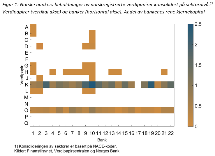 Vi bruker data for verdipapirbeholdninger og store eksponeringer mellom norske banker for å tallfeste modellen for den norske banksektoren. Figur 1 viser bankenes verdipapirbeholdninger (indirekte koblinger) basert på data fra VPS (Verdipapirsentralen) ved utgangen av 2. kvartal 2019. Hver rute viser en banks beholdning av verdipapirer utstedt av en sektor målt i forhold til bankens rene kjernekapital. Vi ser at nesten alle bankene er eksponert mot sektor K (finansierings- og forsikringsvirksomhet) og sektor O (offentlig administrasjon), se nettside til SSB for en oversikt over sektorene. Verdipapirer i disse sektorene er typisk obligasjoner med fortrinnsrett (OMF-er) og stats- og kommuneobligasjoner. OMF-er er obligasjonslån med boliglån som sikkerhet. Siden verdipapirene i vårt utvalg utgjør 118 prosent av bankenes rene kjernekapital, er potensialet for indirekte smitte betydelig.