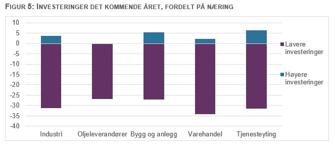 Covid-19-pandemien bidrar til at bedriftenes investeringsplaner for det kommende året nedjusteres, se figur 5. I alle næringene vil majoriteten av bedriftene redusere investeringene, og andelen er høyest blant varehandelsbedriftene. Den tradisjonelle varehandelen har de siste årene hatt utfordringer med stadig økende konkurranse fra netthandel. Derfor har flere bedrifter inntatt en litt forsiktig holdning mot investeringer i kjøpesentre allerede før pandemien brøt ut. Flere av varehandelsbedriftene fikk drahjelp av pandemien i sommer da nordmenn ble nødt til å feriere i Norge, likevel er usikkerheten om veien videre høy også i denne næringen.Når økonomien er usikker ønsker i tillegg færre bedrifter å flytte på seg og flere reforhandler i stedet vilkårene i eksisterende leieavtaler. Forventninger om lav reiseaktivitet fører også til fall i investeringene i hoteller. Kun et fåtall av bedriftene vil investere mer det kommende året som følge av pandemien. Ingen av oljeleverandørene venter økte investeringer det neste året. Usikre framtidsutsikter demper ofte investeringsviljen i næringslivet og kan bidra til at det tar lengre tid å komme ut av en lavkonjunktur. De som er hardt rammet i dårlige økonomiske tider utsetter investeringer, og de som har klart seg godt er varsomme med å investere fordi de er usikre på om de også vil bli påvirket mer senere i konjunktursyklen.
