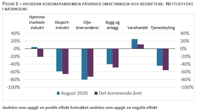 Om lag åtte av ti oljeleverandører og syv av ti eksportindustribedrifter oppga at pandemien hadde en dempende effekt på omsetningen deres i august, figur 2. Nesten like mange tror den vil fortsette å ha en negativ effekt fremover. Også i tjenesteyting og bygg og anlegg er det en overvekt av kontaktene som har mistet omsetning på grunn av pandemien, og i begge næringene er det enda flere som venter en dempende effekt det neste året. Mange av tjenesteyterne og bygg- og anleggskontaktene har jobbet på tidligere inngåtte avtaler, men svak ordreinngang i kjølvannet av koronapandemien vil føre til lavere aktivitet det neste året. Tjenesteyterne tror at pandemien vil dempe etterspørselen fra både husholdningene og næringslivet. Samlet sett ser det ut til at omsetningen i hjemmemarkedsindustrien var lite påvirket i august, mens den ventede effekten fremover er negativ. Det er særlig byggevareindustrien som venter en dempende effekt det neste året, noe som må sees i sammenheng med forventninger om lite investeringer i private næringsbygg.