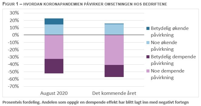 I mars i år ble mange norske bedrifter hardt rammet av covid-19 pandemien og tiltakene for å hindre smittespredning. Etter hvert som Norge fikk bedre kontroll på smittespredningen og smitteverntiltakene ble lettet opp, tok aktiviteten i norsk økonomi seg opp igjen. Likevel oppga over halvparten av bedriftene i Regionalt nettverk at forhold knyttet til koronapandemien fortsatt hadde en dempende effekt på omsetningen i august, se figur 1. Hos litt under enn en fjerdedel av bedriftene bidro de til å trekke opp salget. Omsetningen hos den siste fjerdedelen av bedriftene er lite påvirket av forhold relatert til pandemien.