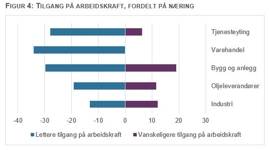 Over halvparten av bedriftene har permittert hele eller deler av arbeidsstokken som følge av covid-19-pandemien, men mange har tatt de ansatte tilbake igjen. Likevel venter nærmere hver fjerde bedrift lettere tilgang på arbeidskraft det neste året, mens rundt hver tiende bedrift tror tilgangen blir vanskeligere. Det er spesielt varehandelsbedriftene, tjenesteyterne og kontaktene innen bygg og anlegg som venter at tilgangen vil bli lettere som følge av pandemien, se figur 4. Også bedrifter som tradisjonelt har hatt problemer med å få tak i arbeidskraft, som for eksempel innen IT og tekniske fag, venter lettere tilgang på arbeidskraft fremover. For mange av bedriftene er det ikke aktuelt å rekruttere fordi det er usikre tider, andre bedrifter opplever at de ansatte ikke ønsker å flytte på seg når de blir usikre på økonomien. For noen har pandemien gjort det nødvendig å gjøre tilpasninger i arbeidsstokken for å effektivisere og redusere kostnader. Majoriteten av de som ansetter sier at det er flere søkere enn normalt i år og at det er mange gode søkere.