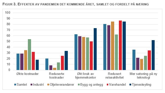 På spørsmålet om hvilken effekt covid-19-pandemien vil ha for virksomheten det kommende året svarte 8 av 10 bedrifter at de vil ha redusert reiseaktivitet, se figur 3. Over 60 prosent av bedriftene svarer at de vil ha økt bruk av hjemmekontor også det kommende året. Mange svarte også at de venter lavere investeringer, økte kostnader og mer satsning på ny teknologi.