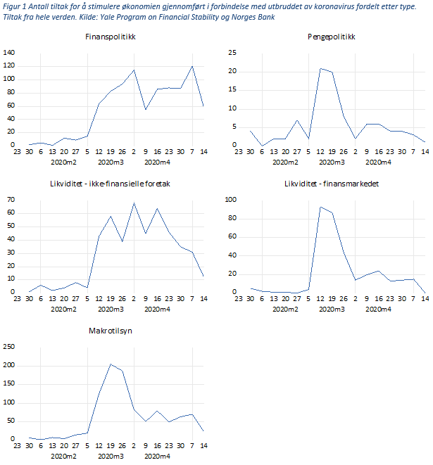 «Yale Program on Financial Stability» har gjennom krisen registrert nye tiltak som ble gjennomført innenfor de ulike områdene – finanspolitikk, pengepolitikk, likviditetsstøtte og makrotilsyn – i et bredt globalt utvalg. Totalt er over 2000 tiltak registrert. Vi har fordelt antallet tiltak i fem ulike kategorier, se figur 1. Nå er det ikke noen direkte sammenheng mellom antall tiltak og viktigheten av hvert enkelt tiltak, men antallet tiltak iverksatt på tvers av land sier noe om når ting ble gjennomført.