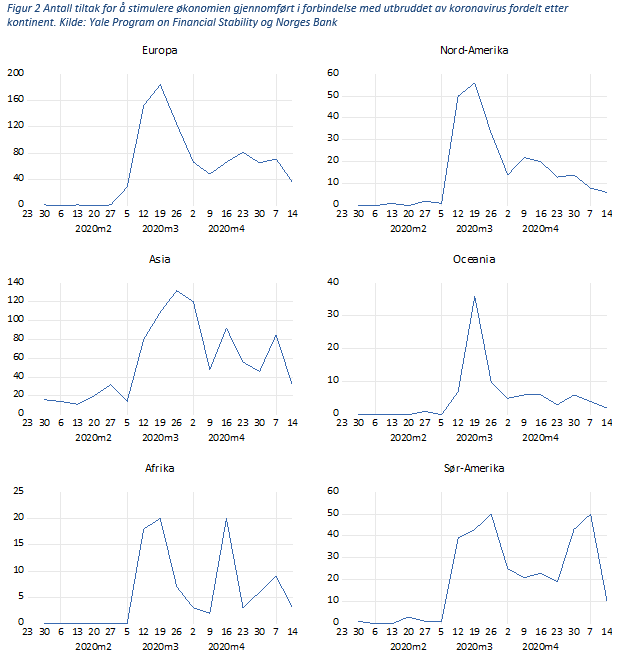Hvis vi ser på tiltak fordelt mellom regioner, finner vi, ikke overraskende, at tiltakene kom først i Asia. I Afrika og Sør-Amerika, som ble rammet sist, er de som fremdeles har høyest aktivitet. Men det mest påfallende er hvor sammenfallende antall tiltak er på tvers av kontinenter. Det var krisen i mars som utløste de økonomiske tiltakene. Koronaviruset vil spres fra land til land i sitt eget tempo. Den økonomiske krisen – kanalisert gjennom finansielle markeder – traff hele jordkloden på likt.