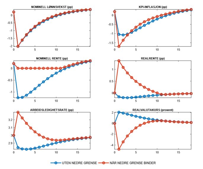 For å illustrere poenget har vi simulert virkningene av lavere lønnsvekst i en standard ny-keynesiansk modell for en liten åpen økonomi.[1] I modellen blir valutakursen bestemt av udekket renteparitet, og det er tregheter i lønninger og priser, inkludert prisene på importerte varer. Vi antar at økonomien i utgangspunktet er i en situasjon hvor inflasjonen og lønnsveksten er lav, og renten er svært nær sin nedre grense (som er antatt å være 0). Så inntreffer det et negativt lønnssjokk, altså at lønnsveksten blir enda lavere. Vi sammenligner to scenarier: I det første scenariet begrenses ikke rentebanen av noen nedre grense. I det andre scenariet binder grensen slik at renten ikke kan senkes like mye som den normalt ville blitt. Vi ser at lavere lønnsvekst i det normale tilfellet svekker realvalutakursen og dermed styrker konkurranseevnen. Realrenten faller, og arbeidsledigheten går ned. Når den nedre grensen binder, blir virkningen motsatt; realrenten øker, realvalutakursen styrker seg, og ledigheten stiger. Lønnsmoderasjon fremstår nå som en svært dårlig medisin.
