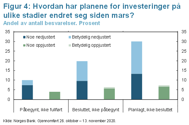 Ifølge Regionalt nettverk var det særlig investeringsprosjekter på planleggingsstadiet som ble avlyst eller utsatt gjennom 2020, se figur 4. Trolig ble omfanget av pågående investeringer i noen grad nedskalert, men ikke vesentlig endret. Nedgangen i norsk økonomi som følge av virusutbrudd og strenge smittevernstiltak ble mindre og mer kortvarig enn først ventet. BNP for Fastlands-Norge falt med 3,0 prosent i 2020, mens Norges Bank og andre prognosemakere i mai 2020 ventet et tilbakeslag på over 5 prosent. Det er lett å tenke at bedriftene, etter hvert som den økonomiske aktiviteten tok seg opp, hentet frem igjen de planlagte, ikke besluttede prosjektene de tidligere hadde utsatt eller avlyst.