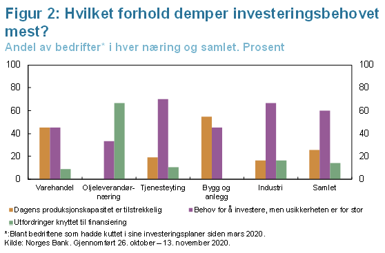 27 prosent av bedriftene i Regionalt nettverk svarte at forventede investeringer samlet sett hadde falt før pandemien til slutten av 2020. Mange av disse bedriftene svarte at de ønsket å investere, men syntes usikkerheten var for høy, se figur 2. Det var særlig bedriftene innenfor tjenesteyting og innen industri som meldte at usikkerheten dempet investeringsviljen. En del av bedriftene svarte også at de ikke hadde behov for å øke produksjonskapasiteten, noe som må sees i sammenheng med at etterspørselen hadde falt for mange bedrifter.