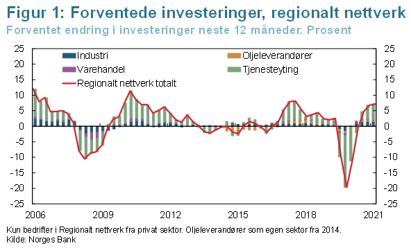 Siden 2006 har Norges Bank spurt bedriftene i Regionalt nettverk om hvordan de ser for seg sin egen investeringsaktivitet det nærmeste året, se figur 1. Etter et markert fall i forventningene, gjennomførte vi i fjor vinter et spesialtema i nettverket om hvordan bedriftene endret sine investeringsplaner fra starten av pandemien til slutten av året. Vi spurte også bedrifter i Norges Banks forventningsundersøkelse om hvilke forhold som normalt påvirker deres investeringer. Denne bloggen er basert på resultatene fra disse undersøkelsene.