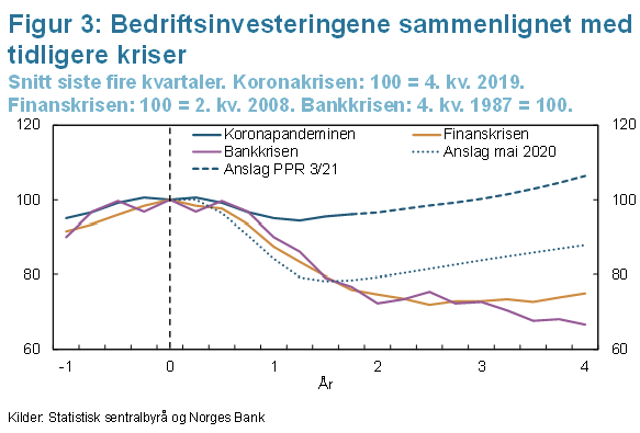Bedriftsinvesteringene har falt mindre siden 2019 enn investeringsplanene i Regionalt nettverk våren 2020 skulle tilsi, og investeringsanslagene i Norges Banks pengepolitiske rapporter har gradvis blitt justert opp ettersom de faktiske tallene har kommet inn høyere enn ventet. Ingen kriser er like, men foreløpige nasjonalregnskapstall viser at investeringene har falt vesentlig mindre enn under både finanskrisen og bankkrisen, se figur 3.