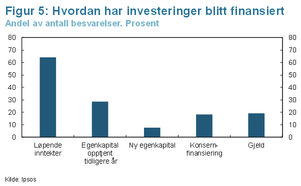 Bedriftene i Forventningsundersøkelsen trekker frem løpende inntekter og tidligere opptjent egenkapital som viktige finansieringskilder for investeringene, se figur 5. Nedstengingene kunne i så måte ha satt begrensninger for bedriftenes finansieringsmuligheter. En historisk lav styringsrente og myndighetenes omfattende støtteordninger har bidratt til å redusere nedgangen i etterspørselen, dempet usikkerheten og kompensert bedriftene for inntektsfall under nedstengingene det siste året. Hardt rammede bedrifter har trolig måttet tære mindre på overskudd fra tidligere år enn uten slike tiltak, og bedriftenes tilgang på finansiering ser altså ikke ut til å ha hindret investeringsaktiviteten nevneverdig i perioden.